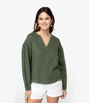 100% linen. Comfort fit.Dropped shoulders.V shaped buttonless placket.Gathered at armholes and cuffs. Recycled plastic single button cuff.Straight hem.Tag free.Garment washed after assembly, colours may vary slightly.Special Order items are non-stock Items ordered from the supplier. These items are non-returnable, and lead times may vary.