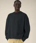 Unisex recycled cotton boxy crew neck sweatshirt. Set-in sleeves. 1x1 rib at sleeve cuffs and hem. Twin-needle topstitching centred on seams at shoulders, armholes, sleeve cuffs and hem. Inside herringbone back neck tape. Self-fabric half-moon at the back neck. Contains 50% GRS-certified recycled cotton and 50% OCS-certified organic cotton, certified by Control Union CB-CUC-1393082.